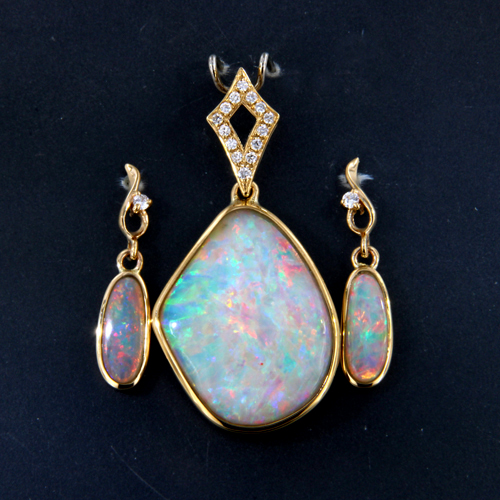 Buntes Set mit Ohrringen und Anhänger aus australischen Opalen und Diamanten in 585er Gold